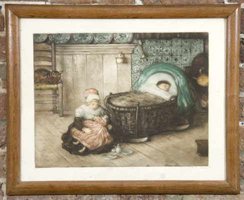Antique 19th Century Gauche Signed of Baby & Child Playing with Doll & Tea Set
