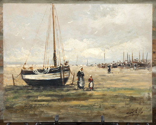 Antique Brittany Oil of Ships Framed & Signed by Castell