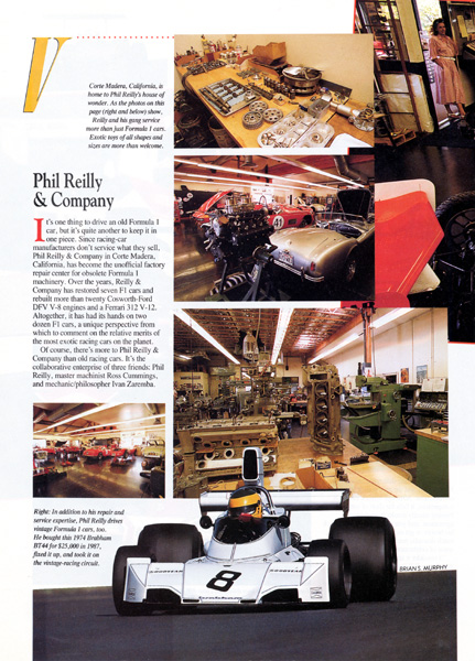 It's one thing to drive an old Formula1 car, but it's quite another to keep it in one piece. Since racing -car manufacturers don't service what they sell, Phil Reilly & Company in Corte Madera, California, has become the unofficial factory repair center for obsolete factory machinery. Over the years, Reilly & Company has restored seven F1 cars and rebuilt more than twenty Cosworth-Ford DFV V-89 engines and a Ferrari 312 V-12. Altogether, it has had its hands on two dozen F1 cars, a unique perspective from which to comment on the relative merits of the most exotic racing cars on the planet. Of course, there's more to Phil Reilly & Company than old racing cars. It's the collaborative enterprise of three friends: Phil Reilly, master machinist Ross Cummings, and mechanic/philosopher Ivan Zaremba. Fellow racing enthusiasts, they worked in Berkeley, California, at the Griswold shop, one of the first enterprises devoted to the restoration of old cars on a large-scale basis when it went into business in 1973. Since setting out on their own as Phil Reilly & Company in 1982, their resume now includes about 100 cars, including Alfa Romeos, Bugattis, and Hispano-Suizas that have been acknowledged as masterpieces. Phil Reilly's corner of the world near Sears Point International Raceway has become the heartland of vintage Formula 1 in this country, and Reilly has had much to do with it. In 1987 he found a Brabham BR44 rolling chassis for sale, and since he had great memories of the car's winning the 1974 U.S. Grand Prix, he bought it for $25,000. Later he discovered that it was a BR42 tarted up in BR44 bodywork, but he put it back together anyway and ran it in open practice at Sears Point. Pretty soon, his friends and customers decided old F1 cars were a neat deal, too, and bought their own, confident that Reilly could put them right for the racetrack. Reilly figures there are now about two dozen of them on the West Coast. A temperamental and well-used racing car seems like a formula for disaster, but Reilly reports that these old F1 cars are surprisingly safe and reliable: "These are mostly pre-1983 English kit cars, with aluminum tubs and DFV engines. |